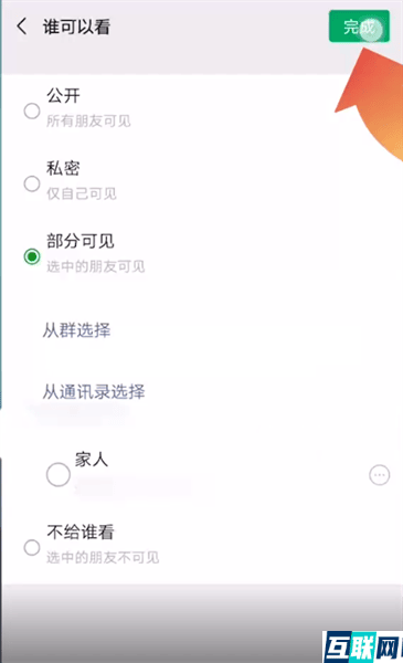3. 接下来点击部分可见,选择好友后可以选择是否保存为标签,点击完成即可设置为部分人看了。