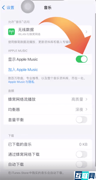 2. 找到“显示Apple Music”选项,滑动按钮关闭显示Apple Music就可以关闭屏幕显示了。