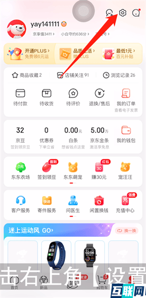 1. 首先打开京东app,然后点击右下角【我的】图标,接着点击右上角【设置】选项,