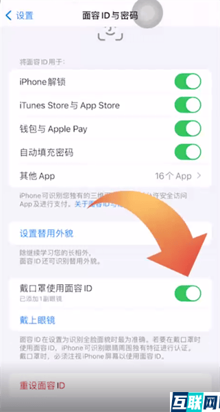 2. 接下来输入锁屏密码,然后滑动按钮开启“戴口罩使用面容ID”就可以设置成功了。