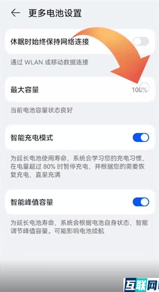 3. 接下来即可看到最大容量选项了,100%是电池健康的理论值,使用一段时间后会产生损耗。