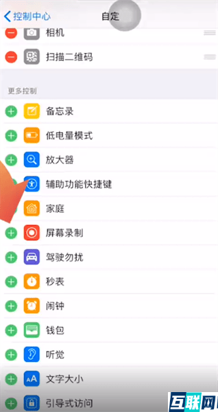 2. 再点击自定控制,然后添加屏幕录制,