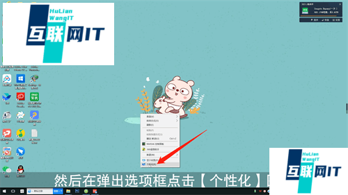 1. 首先在电脑桌面空白处右键鼠标,然后在弹出选项框点击【个性化】图标,