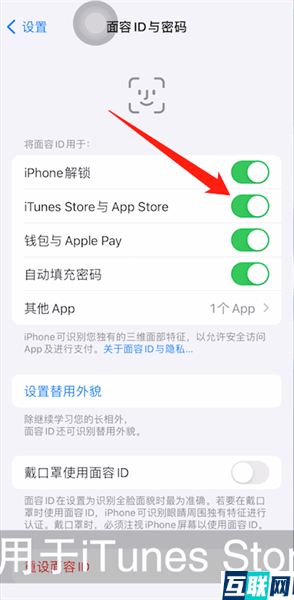 3. 最后返回面容ID与密码页面,将面容ID用于【iTunes Store与App Store】选项右侧按钮打开,就可以在App Store中使用面容识别下载软件了。