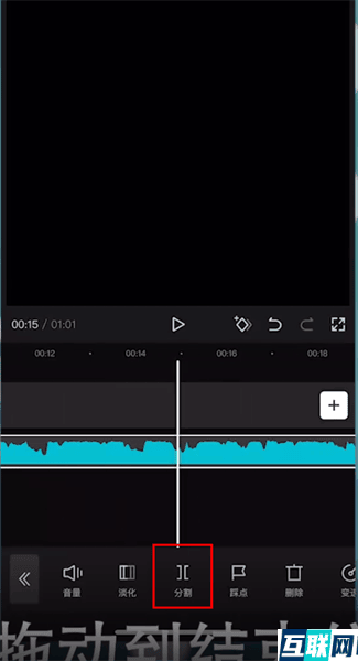 3. 点击音频剪辑列,拖动到中间要截取部分的开头,点击【分割】,再拖动到结束位置,点击【分割】,再拖动截取部分到最前端,把前面的音乐放置在后面即可。
