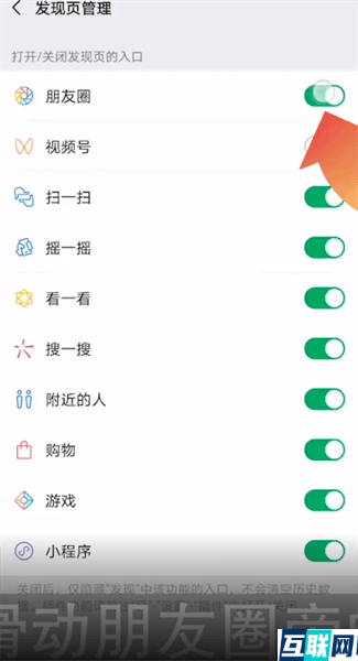 3. 进入通用页面后点击发现页管理,然后滑动朋友圈旁的按钮即可成功关闭微信朋友圈功能了。