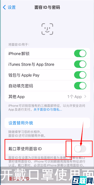 3. 接下来点击打开戴口罩使用面容ID右侧开关,在弹出窗口选择戴口罩使用面容ID,最后录入自己的面容ID即可。