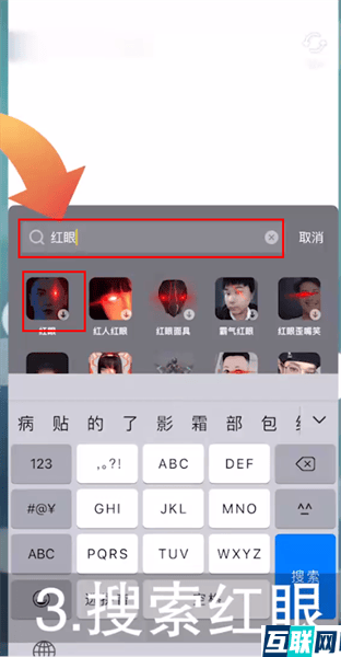 3. 搜索【红眼】,点击【红眼】特效即可使用该特效进行拍摄了。