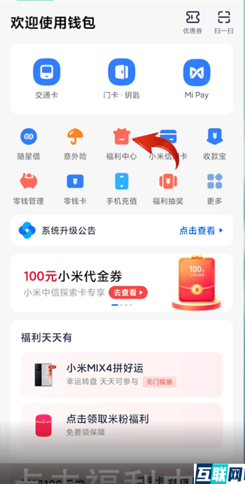 2. 2.小米钱包中用户可以使用NFC功能,也可以查看领取一些优惠服务,点击福利中心可以领取并查看小米手机中的优惠券和兑换券。