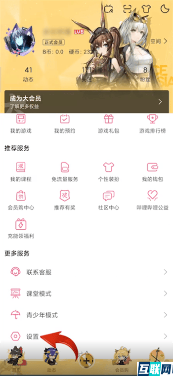 2. 2.在B站主页面中点击右下方的我的选项,随后拉动个人页面至底部选择设置。