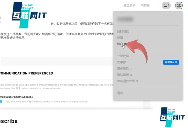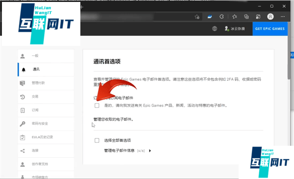 3. 3.最后在账户管理页面中点击通讯,并勾选订阅epic商品优惠的电子邮件即可,epic领取的优惠券会自动添加到游戏账户的卡包之中。