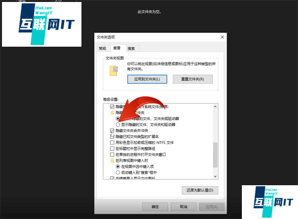 2. 2.选择设置窗口上方的查看栏,再下拉找到【显示隐藏的文件、文件夹和驱动】,勾选设置项后点击确定即可保存文件夹设置。