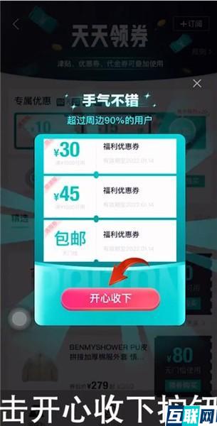 3. 分享完成后返回【得物】客户端,就可以看到获得的优惠券了,下拉优惠券就可以看到无门槛包邮福利优惠券了,再点击【开心收下】按钮即可。