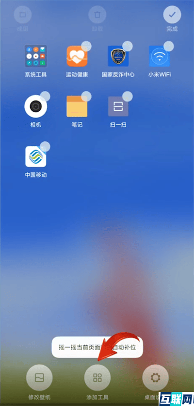 1. 1.在红米手机中长按桌面空白处,随后在编辑模式下方点击添加工具。