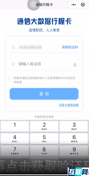 3. 然后点击通信行程卡服务下的“前往获取”,接下来输入手机号,