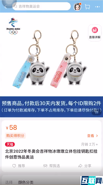 2. 冰墩墩钥匙扣预售价格:58元一个,分别在16:00,19:00,21:00预售,每次预售1000件,每个ID限购2个,付款后30天内发货。
