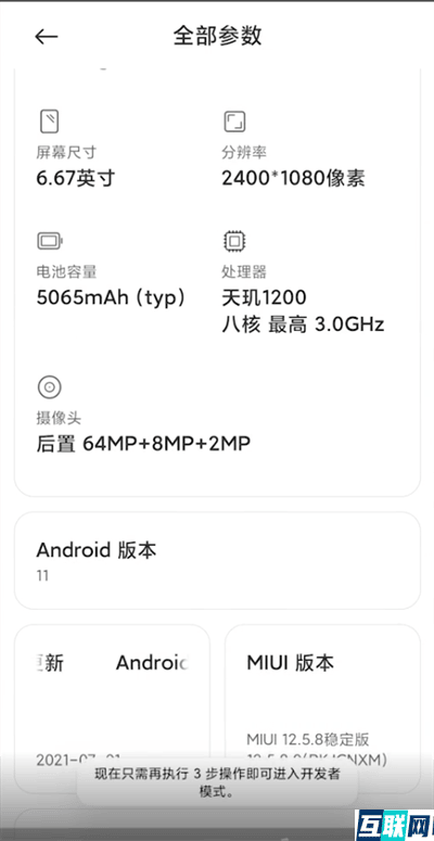 2. 2.在设备设置中可以查看手机的配置和系统版本,随后选择全部参数即可进入手机的参数页面。连续点击子页面下方的miui系统版本,连续点击该图标即可开启手机的开发者模式。