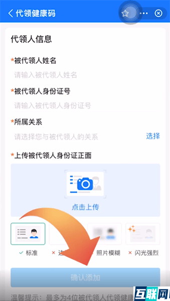 4. 进入代领页面后点击添加服务,输入被代领人信息后再点击上传“被代领人身份证正面”照,接下来点击确认添加就可以代领成功了。
