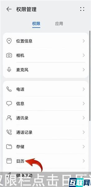 2. 接着点击上方的【权限管理】选项,在【权限】栏点击【日历】选项,