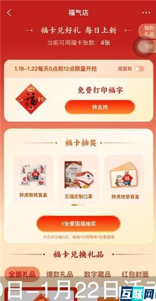 1. 1.免费打印福字 1月19日-1月22日活动期间用户进入【福气店-免费打印福字】,有机会用自己手写的福字免费抢打印的纸质福字贴,每天0点、12点两场,每场新春限量特供,抢完即止。
