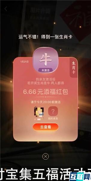 1. 生肖卡是今年的新卡,每张生肖卡上都会印有一个生肖,通过集福卡的方式均有机会获得生肖卡。获得生肖卡后,需要在当天20:00前邀请一个亲友激活生肖卡。每天20:00会从12个生肖中直播开奖出一个中奖生肖。当你已激活的生肖卡和开奖生肖一致,你和亲友都可以获得6.66元添福红包。