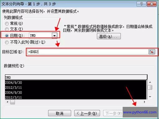 4. “文本分列向导”第3步,也是最后最关键的一个步骤。选择“日期”和“目标区域”。