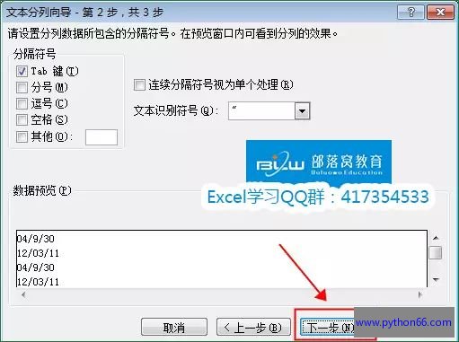 3. 弹出的“文本分列向导”对话框,再次单击“下一步”。