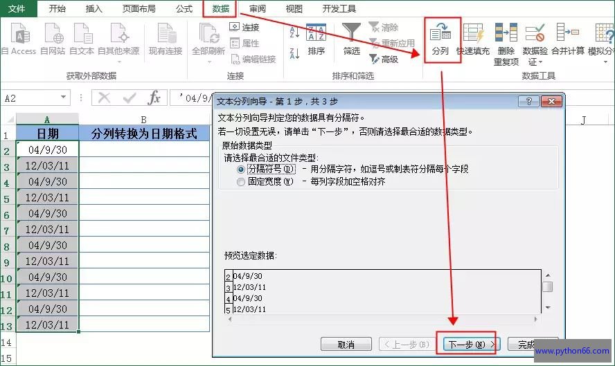 目标区域:是Excel询问我们将A2:A13的日期单元格区域分列之后,放到什么地方,所以我们在B2单元格点击一下,选择B2单元格。